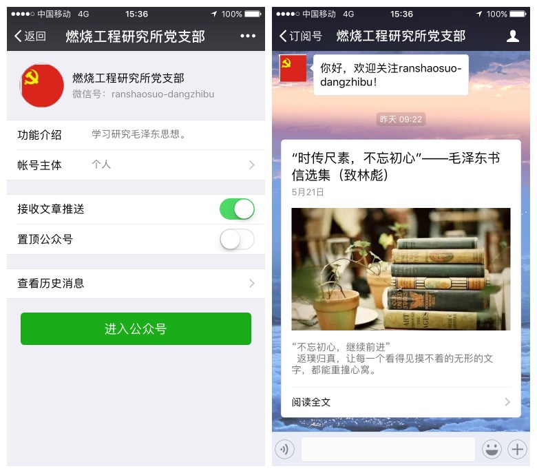 活动开展之初,由党支部宣传委员创建燃烧工程研究所微信公众平台,并在线下进行平台推广。在不定期推送时,每一篇推文我们都播送一篇声情并茂的朗读书信,配以原文另附一段诗词呼应。短短数天,便有众多同学关注了我们的平台。