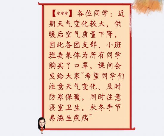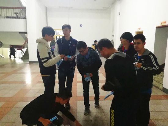 由于入秋以来天气情况多变,尤其在近日供暖后,同学们在早起出门后感觉不适、呼吸不畅。为了鼓励更多同学早起、自习,新葡萄8883官网AMG官网2016级各团支部、小班班委经过商议,为全年级的每名同学购买医用口罩。10月11日早,各团支部、小班班委代表于第一节课前聚集在致知楼二楼大厅,统一进行分配,于课间下发给同学们。希望同学们能够在每一个清爽的早晨,以崭新的面貌和状态迎接十九大的到来。