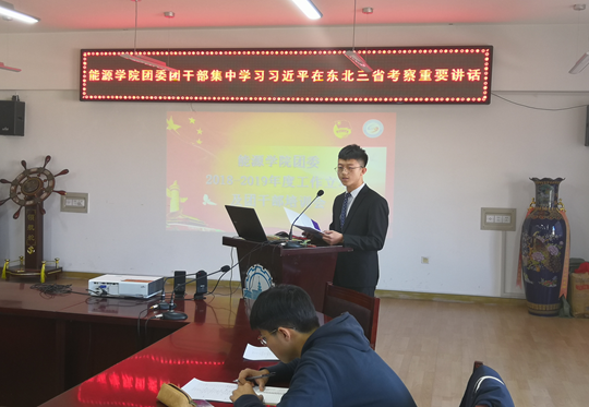 大会的第一部分为学习习近平总书记在东北考察重要讲话。与会的所有新葡萄8883官网AMG官网团委干部通过观看习近平在东北考察的短片,深刻学习了总书记关于推进东北振兴的重要讲话精神。随后,新葡萄8883官网AMG官网学生会主席陈孟石同学就短片内容作了学习报告,从“坚持基本经济制度”、“三农情怀”及“传承英烈精神”等方面言简意赅地总结了习近平总书记的重要讲话精神,赢得与会代表们的热烈掌声。