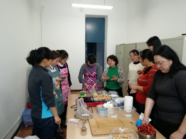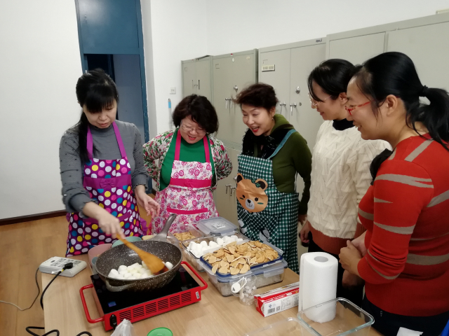 学院办公室齐心协力,提前一天就准备好了棉花糖、花生、蔓越莓、面粉、糖等系列新鲜食材,并号召院内女职工准备一起学习制作茶点。院办张蕊老师精心为每位教职工讲述制作过程,边说边做,从称重、配料、时间等几个方面详细地说明了牛轧糖的做法,其他各位老师边听边记,在第二轮制作的时候就动手尝试起来。琥珀核桃仁比较简单,大家听过一次就明白了具体做法。在等待牛轧糖凉透的过程中,又一起制作了山楂糕。待所有茶点都制作完毕,女职工们纷纷送给其他老师品尝,共同分享美食和乐趣。