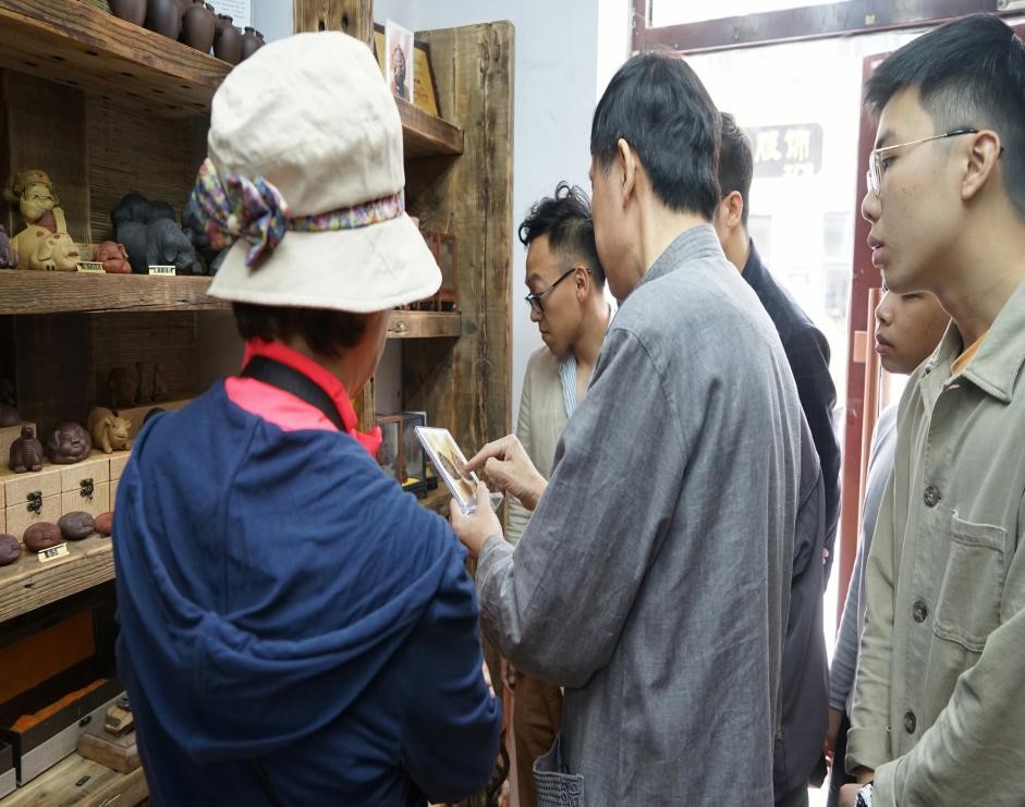 热情的杨先生给同学们科普介绍起了紫砂的制作工艺,同学们也被杨先生那一件件精美的作品所吸引。由于恰好在节假日,老道外的民俗手艺人们都在外面摆摊做东西,杨先生的一位朋友正在那里做紫砂壶,带领同学们去参观了制作过程。紫砂壶制作要经过选料、捶打、造型、晾干、烧制等一系列工艺,即使是经验丰富的艺术家,也需要好几天才能完成一件作品。之会,杨先生邀请同学们参观他烧制紫砂壶的炉子,由于空间的问题只能使用电烤炉,电烤炉的优势在于废品率低,但是烧制的东西不如柴火那样有变化。