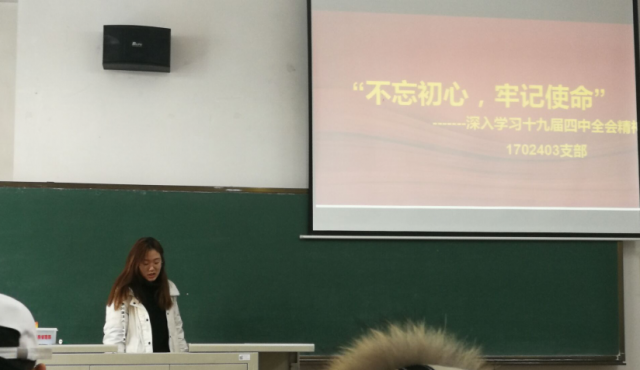 活动一开始,杨诗瑜同学便详细介绍了十九届四中全会的基本情况,向支部成员讲解了十九届四中全会的会议内容、会议精神。为了让同学们深入学习好、理解好、贯彻好十九届四中全会精神。紧接着,杨诗瑜同学为大家播放了一段关于十九届四中全会的学习视频。借助视频以及团支书为大家精心制作的讲解PPT,让同学们更加深刻的认识到我国国家制度和国家治理体系多方面的显著优势。团支书的抛砖引玉,激发了班级更多同学的讨论热情,同学们在这次班会上发言踊跃,情绪高涨,纷纷表达了自己的观点和看法。