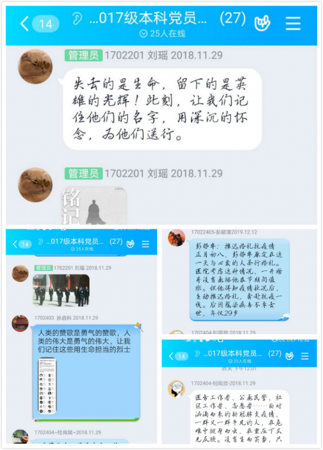 2020年4月4日,为表达全国各族人民对抗击新冠肺炎疫情斗争牺牲烈士和逝世同胞的深切哀悼,举行了全国性的哀悼活动。新葡萄8883官网AMG官网2017级本科生党支部积极响应号召,利用线上平台召开英雄事迹分享活动,向那些在抗疫一线艰苦奋斗,牺牲自己生命的英雄们表达敬意。
