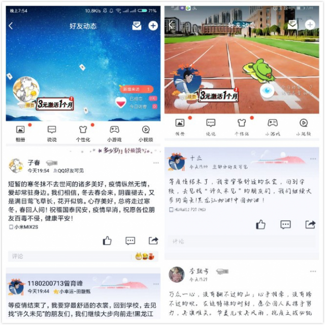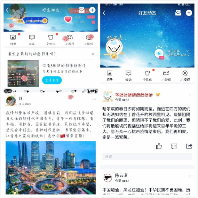 由于疫情的影响,本次团日活动在线上举行,但同学们参与活动的热情丝毫未减。本次活动分为两个环节:第一个环节是同学们根据自己的喜好,在QQ空间或微信发表说说或朋友圈,寄托同学们对万众一心抗击疫情必胜的决心,以及对工大即将迎来百年华诞的真诚祝愿和对国家的赤诚热爱;第二个环节是同学们将自己发出的说说与朋友圈分享到班级群内,与大家共同分享并交流自己的感想。活动过程中,班级里的每一位同学都参与进来,在QQ空间和微信朋友圈积极发表了自己的见解,在班级群里参与分享与讨论。在同学们的积极配合下,本次活动顺利完成。