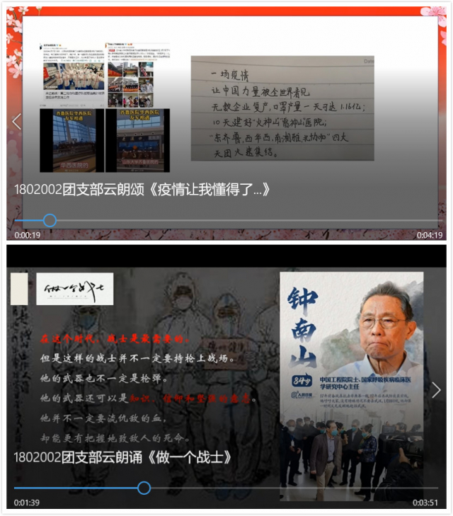 此次活动分为三大主题:红色团支部·爱国力行强信念;战斗团支部·居家战“疫”展风采;青春团支部·薪火相传迎百年。活动由团支书刘艺璇主持、主导,各团日活动小组分别参与各部分内容讲述。