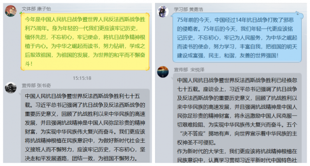 学生会宣传部部长张书奇认为:“习近平总书记强调了抗日战争及反法西斯战争的重要历史意义,回顾了抗战胜利以来中华民族的高速发展,并且强调抗战精神是中国人民弥足珍贵的精神财富,为实现中华民族伟大复兴而奋斗。我们更应该将抗战精神根植在民族意识中,为做好新时代社会主义接班人而不懈努力,应该牢记历史,不忘初心,坚决走和平发展道路,团结一致,为祖国不懈努力。”
