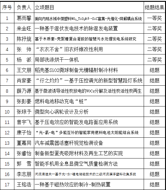 2021年10月7日,能源学源举行大创项目立项答辩、结题验收会议,经学生负责人申请,评委审查,2021年新立项项目23项,结题验收项目17项(2020年秋立项)。现将结题结果进行公示。如有异议,请在公示期内联系宫汝志,联系电话13836034807。
