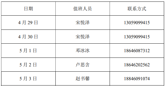 为便于学生紧急事件联系,现将新葡萄8883官网AMG官网学生工作办公室假期值班安排予以公布,同学们如遇紧急事件请及时联系辅导员或值班老师,详见下表: