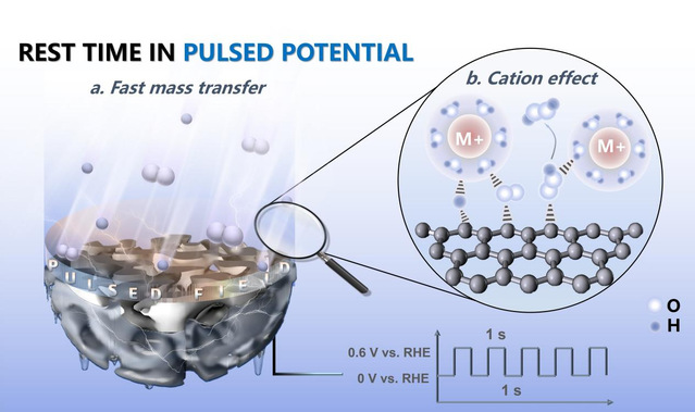 在前期工作中,团队首次发现了低频脉冲电流可抑制H2O2在多孔阴极中的电还原路径,研究了脉冲电催化对界面双电层充放电的影响和对碳材料活性位点的原位稳定与动态激活效应。相关成果发表在《应用催化B: 环境》(Applied Catalysis B: Environmental)、《材料化学学报A》(Journal of Materials Chemistry A)等期刊,获得国内外同行的广泛关注。