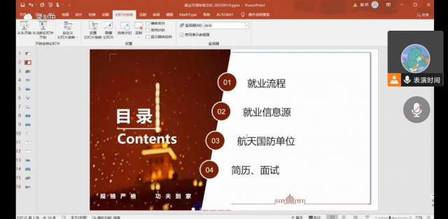 针对当前就业形势,结合各位同学自身实际情况,邱燚从就业流程、就业信息源、航天国防单位介绍以及简历设计与面试等四个方面为同学们开展就业专项指导。会议伊始,邱燚梳理了毕业基本要求,整理了就业相关流程,建议大家提前做好规划与准备,并提醒同学们甄别各种就业信息来源;随后,邱燚介绍了近几年新葡萄8883官网AMG官网毕业生就业方向,着重介绍了各个航天国防单位,建议同学们在选择未来方向时要结合当前客观实际与个人意愿,避免盲从,认真分析后再做出选择,同时欢迎同学们积极向各位老师咨询了解;最后,邱燚为同学们介绍了简历撰写的基本规范,根据前期收集的同学们的简历进行针对性的分析说明,并结合职场礼仪常识为各位同学如何应对面试提供了建议。