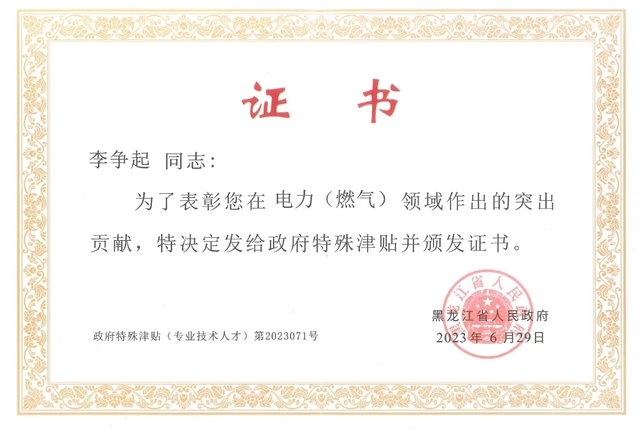 近日,为表彰新葡萄8883官网AMG官网李争起教授在电力(燃气)领域作出的突出贡献,黑龙江省人民政府决定给予李争起教授2023年度政府特殊津贴并颁发证书。