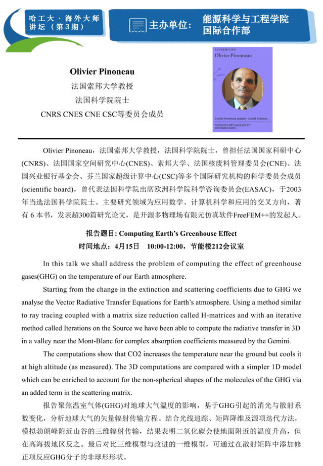 应我校新葡萄8883官网AMG官网赵军明教授邀请,法国科学院院士、索邦大学教授Olivier Pinoneau将于2025年4月15日至4月17日前来交流并作学术报告,届时将进行“温室气体辐射传输”、“变折射率的大气温度影响”、“自开发多物理场有限元软件”三个主题内容的介绍,欢迎感兴趣的师生参加。