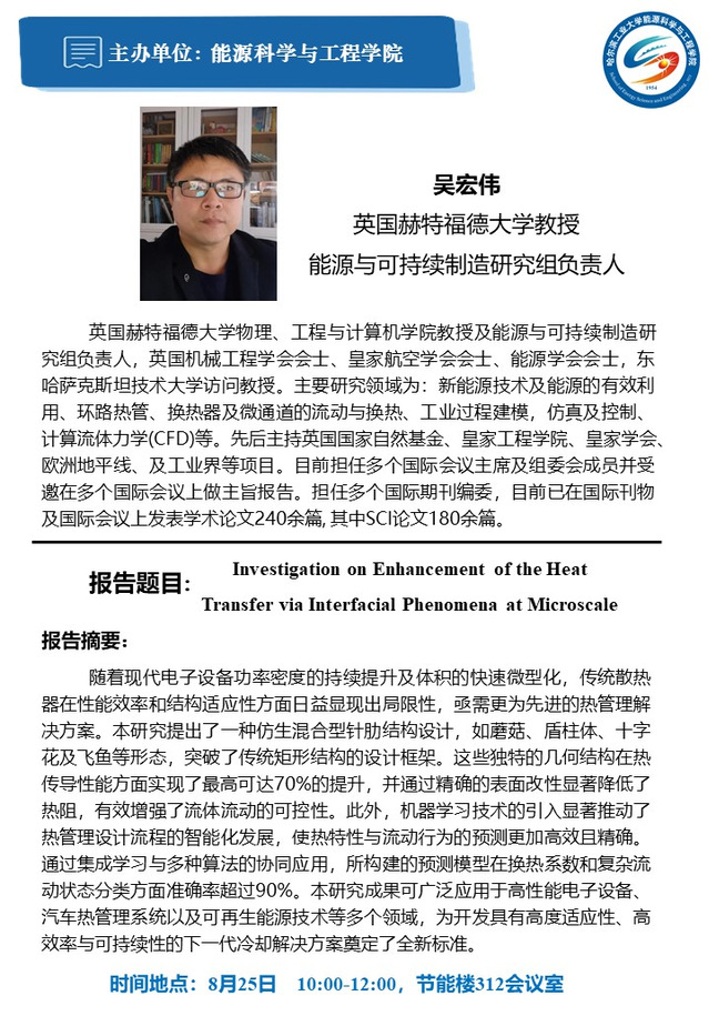 应我校新葡萄8883官网AMG官网赵军明教授邀请,英国赫特福德大学吴宏伟教授将于2025年8月25日前来交流并作学术报告,届时将进行“Investigation on Enhancement of the Heat Transfer via Interfacial Phenomena at Microscale”主题讲座,欢迎感兴趣的师生参加。
