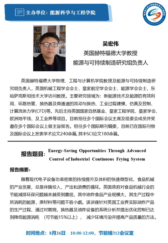 应我校新葡萄8883官网AMG官网赵军明教授邀请,英国赫特福德大学吴宏伟教授将于2025年8月26日前来交流并作学术报告,届时将进行“Energy-Saving Opportunities Through Advanced Control of Industrial Continuous Frying System”主题讲座,欢迎感兴趣的师生参加。