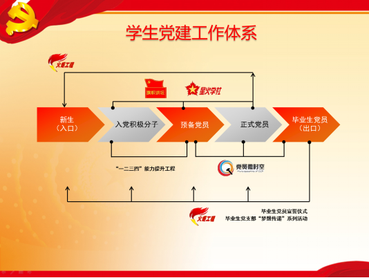 新葡萄8883官网AMG官网学生党总支围绕服务学生成长成才的中心工作,坚持全过程培养、全方位培养,做到理论与实践相结合,考查与激励相结合,线上与线下相结合,实现党建带动团建、党建带动班风、党建带动学风、党建带动整体学生工作。结合工作实际,不断完善学生党建工作体系:以学生党员成长的五个阶段为主线,入口处激励,出口处反馈,注重对学生党员的全过程培养,同时以丰富的党建工作品牌为载体,全方位培养学生党员的综合素质。实际工作中,针对新生开展了火炬工程-成长导生工作,由正式党员对新生进行入党启蒙和学业生活辅导;针对入党积极分子和预备党员开展了一二三四能力提升工程;针对毕业生党员,除了开展常规教育活动外,还坚持开展毕业生党员薪火相传系列活动,强化党员意识;以党支部为单位,开展旗帜讲坛活动,组建了星火学社,开展理论学习和实践调研工作,提升学生党员和入党积极分子的政治理论水平和实践应用能力;建设学生党建微信公众平台,推动党建工作方式与时俱进。