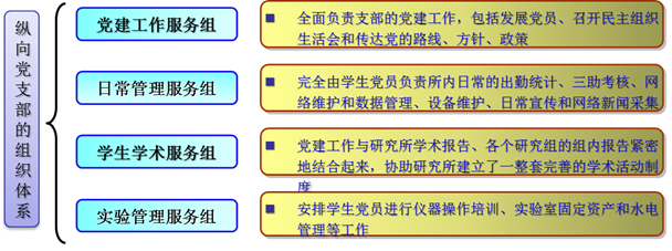2004年,新葡萄8883官网AMG官网燃烧工程研究所率先在学院创立了按研究所建立研究生党支部的新模式,到2009年1月,学院实现了全体研究生都以研究所为单位成立纵向党支部。实践证明,纵向党支部模式能够克服横向党支部的一些不足,打破了年级界限,支部的稳定性和传承性明显增强;凝聚了相同学科方向的研究生党员,更有利于支部活动的开展和深入;实现了以党建带科研、以科研促党建的良好局面,使研究生党支部焕发新的活力。其中燃烧所研究生党支部并作为基层党支部代表在学校党建工作案例报告会、践行社会主义核心价值观报告会上做典型发言,并多次获得校先进基层党组织十佳等荣誉称号。